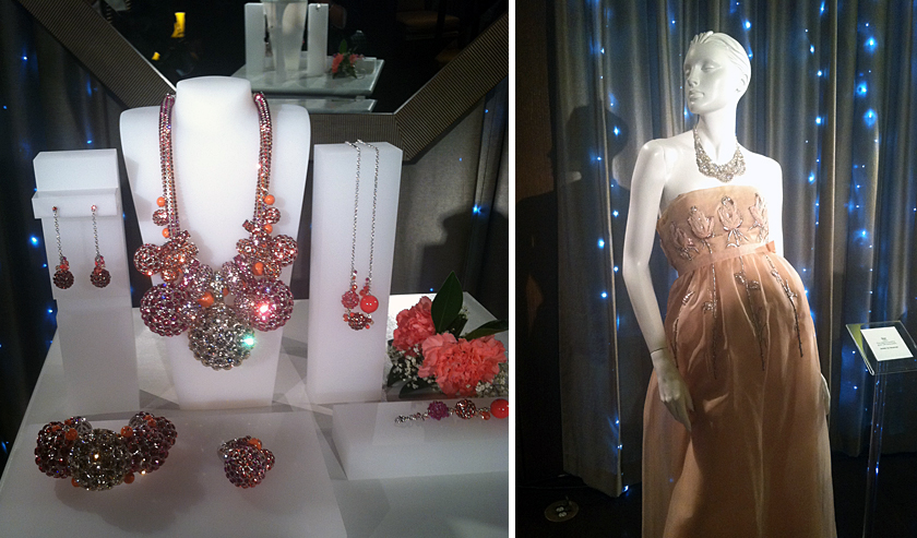 upon entering, Pierre Cardin Haute Couture which saw a decade ball gown with flower detail matched with a stunning romantic looking necklace and bangle of which raspberry pink and
