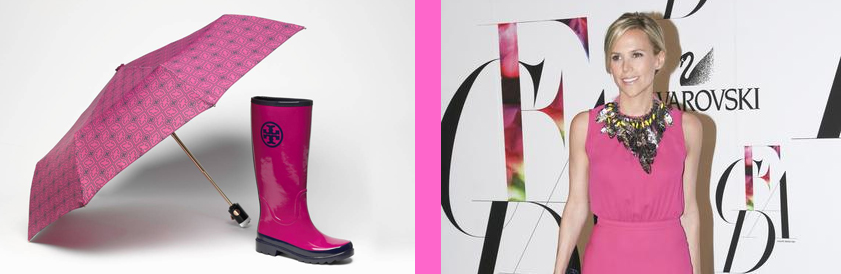 Get pretty in pink Tory Burch style. The classic American sportswear designer introduces an limited edition pink printed umbrella and rain boot to support